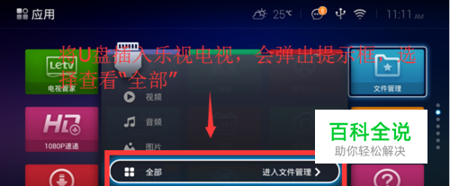 将U盘插入乐视电视的usb插口,会弹出提示框,然后选择查看“全部”;