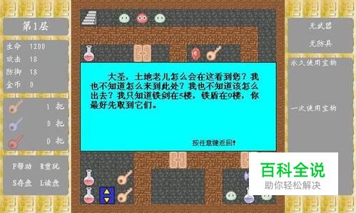 【一】、前10层攻略。 直奔三楼,吃中上方的钥匙和弹药, 与观音菩萨对话,恢复火眼金睛功能(快捷键A), 直奔五楼,取铁剑,右上方拿一堆钥匙, 直奔九楼,取铁盾。 然后杀回一楼,左下脚取楼层跳跃器(PAGEUP或PAGEDOWN可直接上下楼)。 然后有选择地杀到10楼,过关。 注意前10层不需要升级,后面升级,攻防升级数大!
