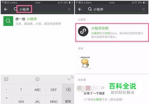 2、搜索小程序名称,则会出现相应的【微信小程序】,点击进入。