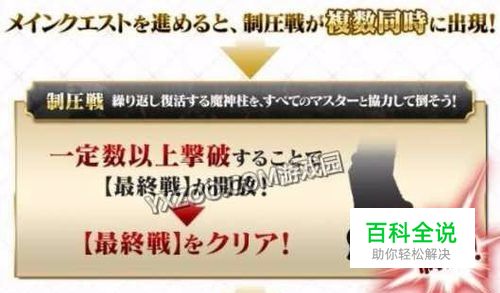 主线(第2节通关后)——制压战(重复压制至打完血条)——通关制圧戦【最終戦】——继续进行主线(第9节及以后) 终章主线到第二节通关后,与魔神柱战斗的「制圧戦」就会出现。因为魔神柱打倒了还会不断的复活,需要全服master协力进行一定数量的压制。所有的柱子打完后,会开放新的主线副本。