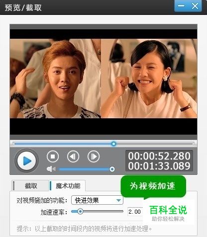 为视频加速,操作非常简单 首先导入视频,软件会自动弹出“预览/截取”对话框,你可以轻松截取视频短片。如果你不需要截取视频,那可以不设置截取参数。为视频加速,我们只需点击“魔术功能”选项卡,在“对视频施加的功能”下拉框中选择“快进效果”,并在“加速速率”一栏向右拖动滑杆,加快视频的速度,非常简单~