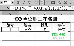 输入表格内容之前,可先在编号单元格(如“C3”)中输入公式“=IF(D3<>"",(COUNTA(\$D\$3:D3)),"")”,然后将公式应用到整个编号所在的列(如图2)。该公式的含义是:如果当前行中的姓名所在单元格不为空的话,就将从第一个姓名所在的单元格开始一直到当前行的姓名所在的单元格区域中统计非空姓名单元格的个数,并将数据自动填写到相应编号所在的单元格中,否则不显示任何内容。