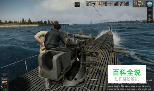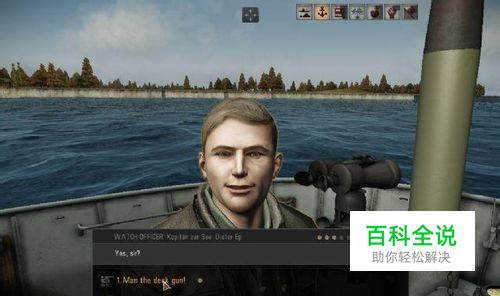 操作步骤1:让你的甲板炮操作手进入站位。 任何的武器都需要人来操作(PS:废话,武器要能自己作战还要你来指挥潜艇?)我们首先爬上指挥塔上面,找到负责水面侦察与瞭望的值班长军官,点击他,要求甲板炮就为。如下图所示。