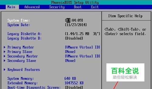 1、随后就会进入BIOS界面,在该界面我们需要了解以下几个重要的操作方法:通过键盘上的方向键进行光标移动;回车键表示“确定”;F10表示“保存并退出”。具体以BIOS界面上的说明为准。如图所示: