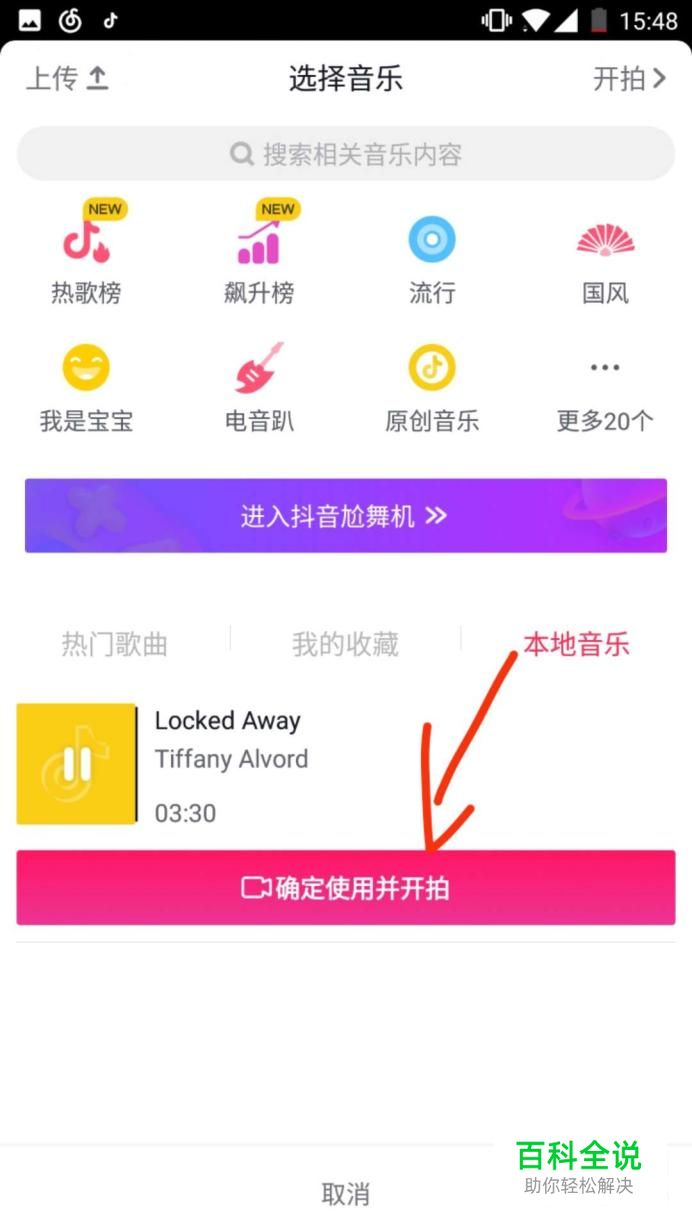 点击该音乐,可以看到“确定使用并开拍”,点击“确定使用并开拍”