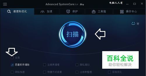 搜狗浏览器被劫持,使用Advanced SystemCare优化软件→勾选恶意软件清除→扫描。