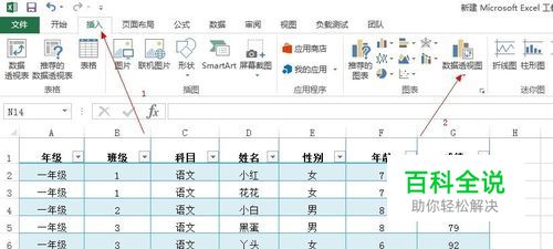 我们以一个学校的学生成绩单为例来制作一张成绩分析图。 打开“插入”页签,点击“数据透视图”工具。