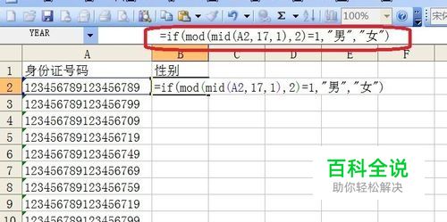 选中“性别”列第一个单元格,输入以下函数:=IF(MOD(MID(A2,17,1),2)=1,"男","女")回车后即得到第一个单元格的性别。选中该单元格,单左下角出现黑色十字形的填充柄时,双击左键,将公式填充到该列最后一个非空单元格。 公式解释: 1、MID(A2,17,1),函数表示从A2单元格第1位为字符开始,提取字符长度为1的那个字符。 2、MOD(MID(A2,17,1),2),对mid函数提取出的那个字符,用mod函数将其除以2,看余数为0还是1,MOD函数是返回两数相除的余数,此为mid函数的返回数除以2,余数分别为0或者1,也就是整除或者不整除,数学中,偶数除2余数为0,奇数除2余数为1,mod和mid函数相配合,即可得知A2单元格的第17位是偶数还是奇数。 3、根据上述判断出的奇数或者是偶数,利用if函数即可返回我们希望得到的结果,即每一个身份证号码对应的性别。 PS:利用MID函数(文本提取函数)还可以根据身份证号码返回每个人的出生年月日等信息。