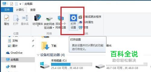 在系统桌面打开“此电脑”后,找到“计算机”选项并打开,在随后出现的下拉菜单中找到“打开设置”选项后打开,如下图: