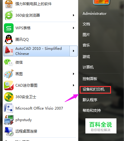 2、在弹出的开始菜单栏中找到设备和打印机,点击它。