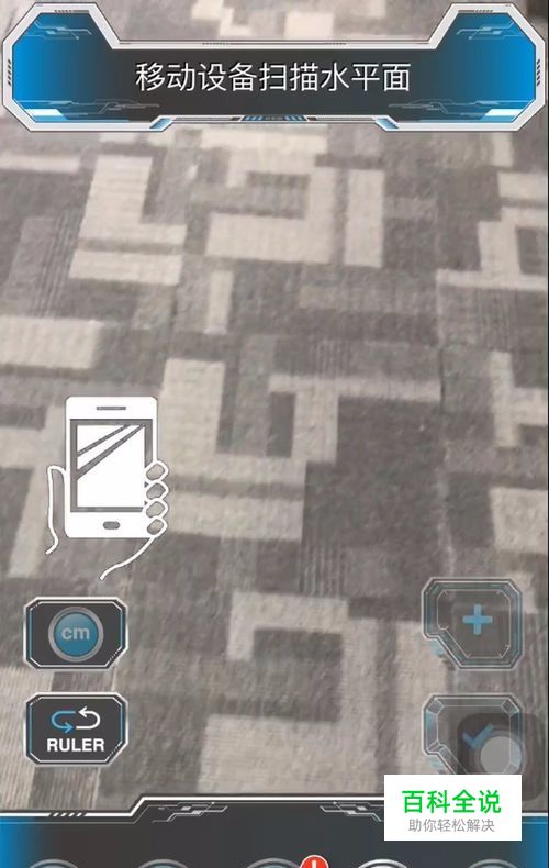 根据提示,拿着手机扫描地面或桌面等水平面,出现黄色的小点和蓝色的网格。在拖把的一头点击+号,标记为起点