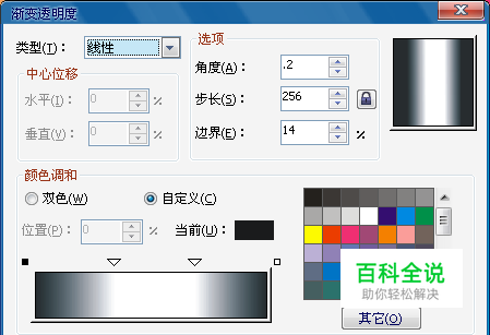 首先大家要明白黑色透明白色不透明,画一个钜形,拉上线性透明,黑色的那端就透明了,点击属性栏上面第一个图标打开渐变透明度对话框,把2端调整成黑色中间是白色就做出了2端透明效果,大家可以任意拉出自己想要的效果。