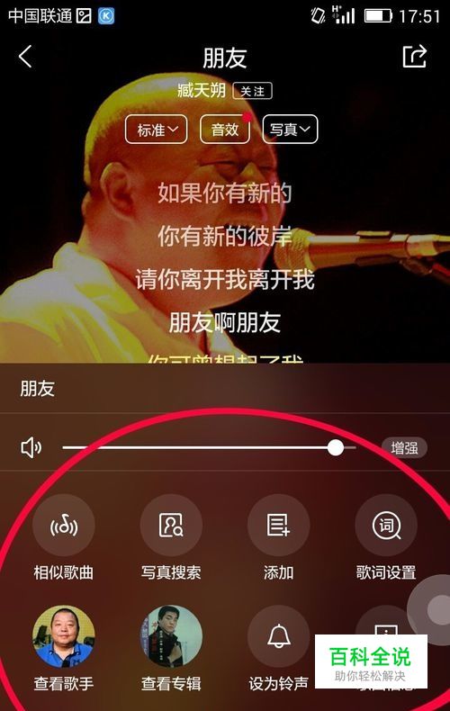 这时我们即可看到所播放歌曲的歌词页面,从页面中可以看到有诸多的功能图标;