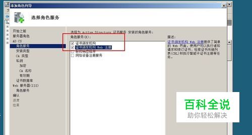 在“服务简介”窗口单击“下一步”,在“选择角色服务”窗口中选择前两个。单击“下一步”按钮