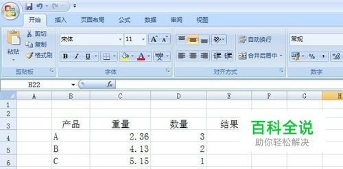 打开一个Excel的文件,输入一个简单的表格,比如产品重量数量表。需要把两数相乘的结果四舍五入放入单元格中,如下图所示。