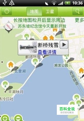 也可以显示景点周围的购物、娱乐、酒店等场所的信息,点击‘”十一”号还可以使用地图缩放功能,对景点进行详细的浏览。
