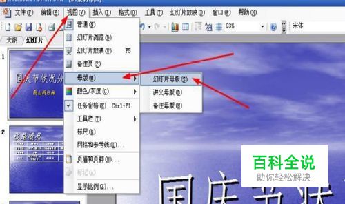 找到菜单栏中“视图”——“母版”——”幻灯片母版“命令。用这种最简单的方法做。