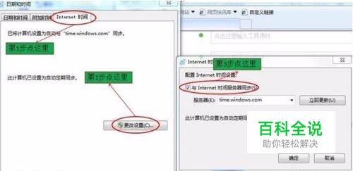 在设置里面选择“Internet时间”在下面选择“更改设置”然后在“与Internet时间服务器同步”前的方框内打勾,如图;