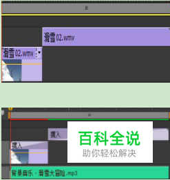 新建“摆入效果”序列,将素材:“滑雪02.wmv”导入【项目】面板中,并将其添加到【视频1】轨道中,并将其剪切成两段,将后面一段拖到【视频2】轨道中,选择【效果】面板中的【3D运动】/【摆入】转场效果,将其添加到【视频1】轨道中的素材的结束和【视频2】轨道中的素材的开始,如下图所示: