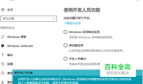 3、进入 Windows 10 设置— 更新与安全— 针对开发人员— 勾选开发人员模式并重启设备;