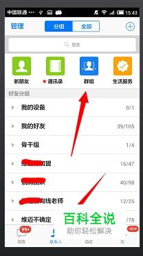 登录2014手机QQ,点击联系人,选中“群组”