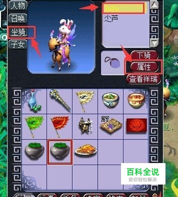 打开【道具】栏,点击左上角【坐骑】按钮,选中需要升级的坐骑,再点击【属性】。