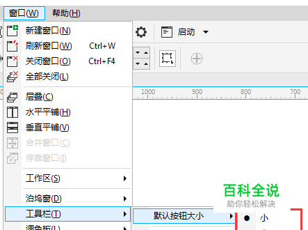 单击菜单栏“窗口>工具栏>默认按钮大小”,在弹出的菜单对话框中,定义按钮大小。另外,还可以鼠标右键单击菜单栏、工具箱、属性栏中的任意一栏目,依次点击“自定义>默认按钮大小”根据需要选择即可。如下图所示。
