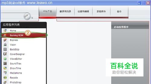 打开mp3刻cd的软件,如下图所示,点击左下角的圆形按钮,打开上拉菜单,选择burning rom。