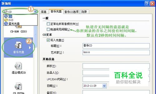 弹出“新编辑”窗口,选择如图“CD”→“音乐光盘”→“新建”。其中可以按需要选择性设置各参数。如“写入光盘”的标题/艺术家等。