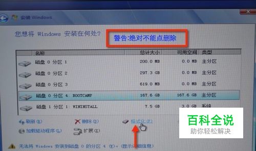 选择好BOOTCAMP分区后点击格式化,切记千万不要点删除,别想删除后再把Windows多分几个区。