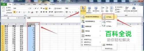 excel打开准备好的数据,点击上方的菜单“开始”-“条件格式”-“突出显示单元格规则”-“大于”