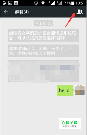 点击进入以后,需要点击右上角的两个头像的图标,即聊天信息的图标,如图所示。
