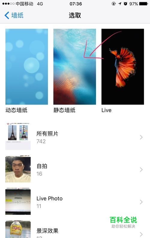 在这里面我们就可以设置不同风格的墙纸了、有动态墙纸、静态墙纸、Live、可以选择自己的照片、我这里就随便选择一张了。