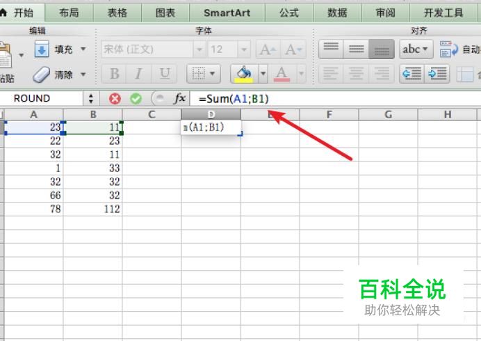 在公式栏里输入: =Sum(A1;B1)的公式,这表示的是使用Sum函数来对A1, B1这二个单元格的数据求和。