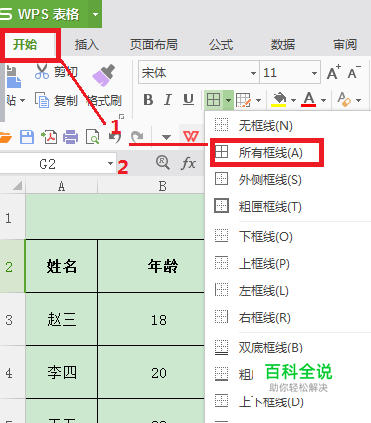 步骤一:开始-田字格-所有选框-再用鼠标选中标题栏下需要表格。