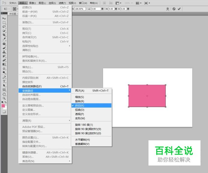 梯形 首先选择形状工具,选择其中的矩形,点击菜单栏编辑选项,下拉菜单中选择‘变换路径中’的‘斜切’,此时就可以按照你想的开始拉出梯形。