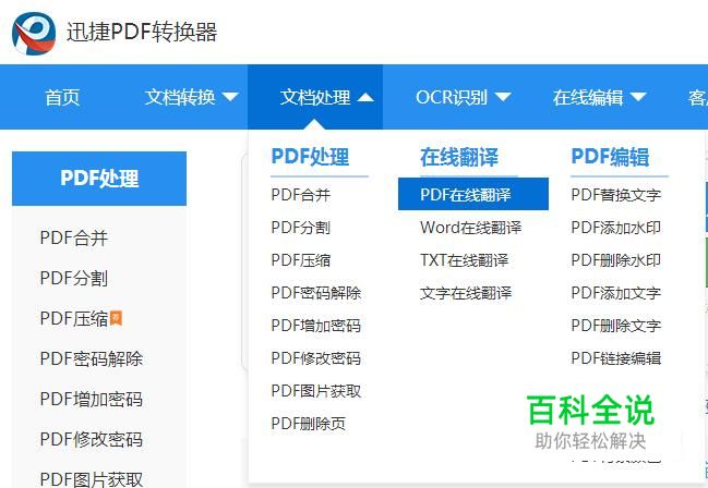 进入在线操作界面后。在菜单栏上的操作功能中找到 文档处理 下的 在线翻译 并点击 pdf在线翻译 选项。
