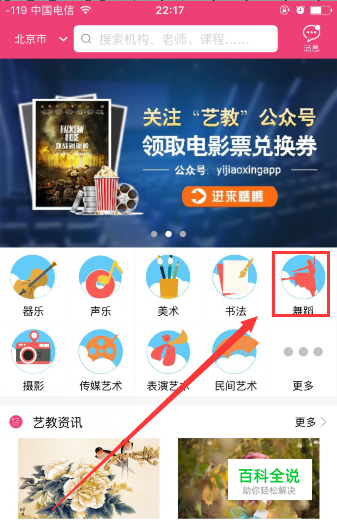 打开“艺教”App首页,选择将要购买的课程,比如舞蹈。