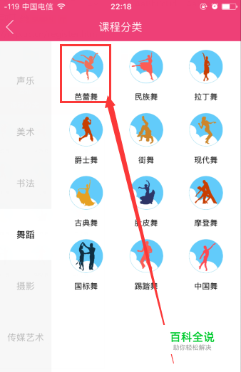 打开舞蹈选项以后,弹出舞蹈课程细化页面,选择芭蕾舞,如下图所示;