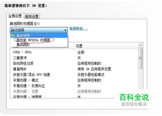 之后在全局设置选项中找到高性能NVIDIA处理器,选择应用这个选项