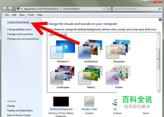 在桌面空白处右击鼠标,选择“个性化”。 在随后弹出的窗口左侧,点击“控制面板”。
