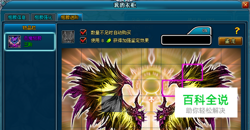 玩法说明: v完成拼图可以进阶,不同阶段的拼图格子复杂程度不同。 v一开始所有格子都是灰色未激活状态,玩家需要消耗1个“天使之心”来鉴定。 v天使之心可在【商城】中【购买】,也可通过每天下午的公会战日常玩法获得。 v天使之心有不同等级,不同进阶的拼图消耗的天使之心不同。2个一级天使之心可合成1个二级天使之心,2个二级天使之心可合成1个三级天使之心。 v每次鉴定可随机激活一个图块。玩家也可以花费一定的金叶子,来加强鉴定效果,一次鉴定两个图块,不同阶段的拼图加强鉴定效果需要的金叶子不同。 v每次鉴定是对所有的图块进行鉴定,已经激活的图块也会被再次鉴定到。 v激活所有图块才算完成拼图。 v只有我的衣柜中已经激活的翅膀,才会在进阶面板的翅膀列表中显示。 进阶效果 Ø进阶后翅膀等级、基础属性、品质、外形、翅膀名字颜色都将随着进阶发生改变。