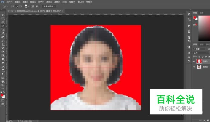 由于证件照的背景是纯色的,这里就可以利用魔棒工具,一键选择出背景,然后按Delete键删除就可。然后新建图层,填充你想要的颜色,放在人物图层下。