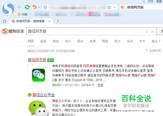 首先我们需要打开搜狗浏览器,搜索“微信网页版”,然后找到一个后面有官网标识的页面,点击进入,如图所示。