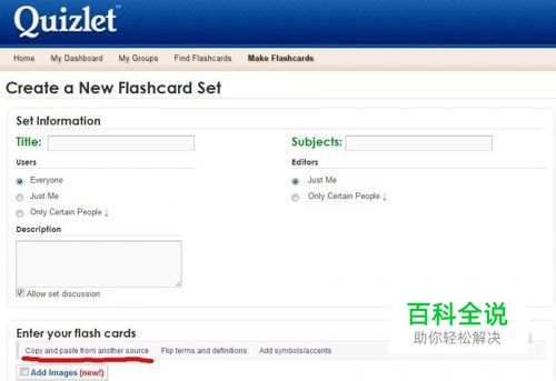 制作卡片需要在卡片制作网上进行。首先需要一份单词表,必须是文本,不能是表格,这种单词表网上很多,我自己找了GRE和TOEFL词汇的。然后注册成为网站的用户。进入之后点击Make Flashcards