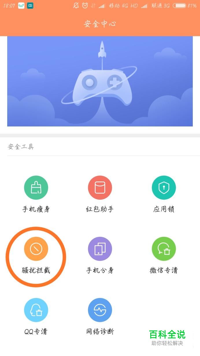 进入手机自带安全中心,在软件最下方找到骚扰拦截