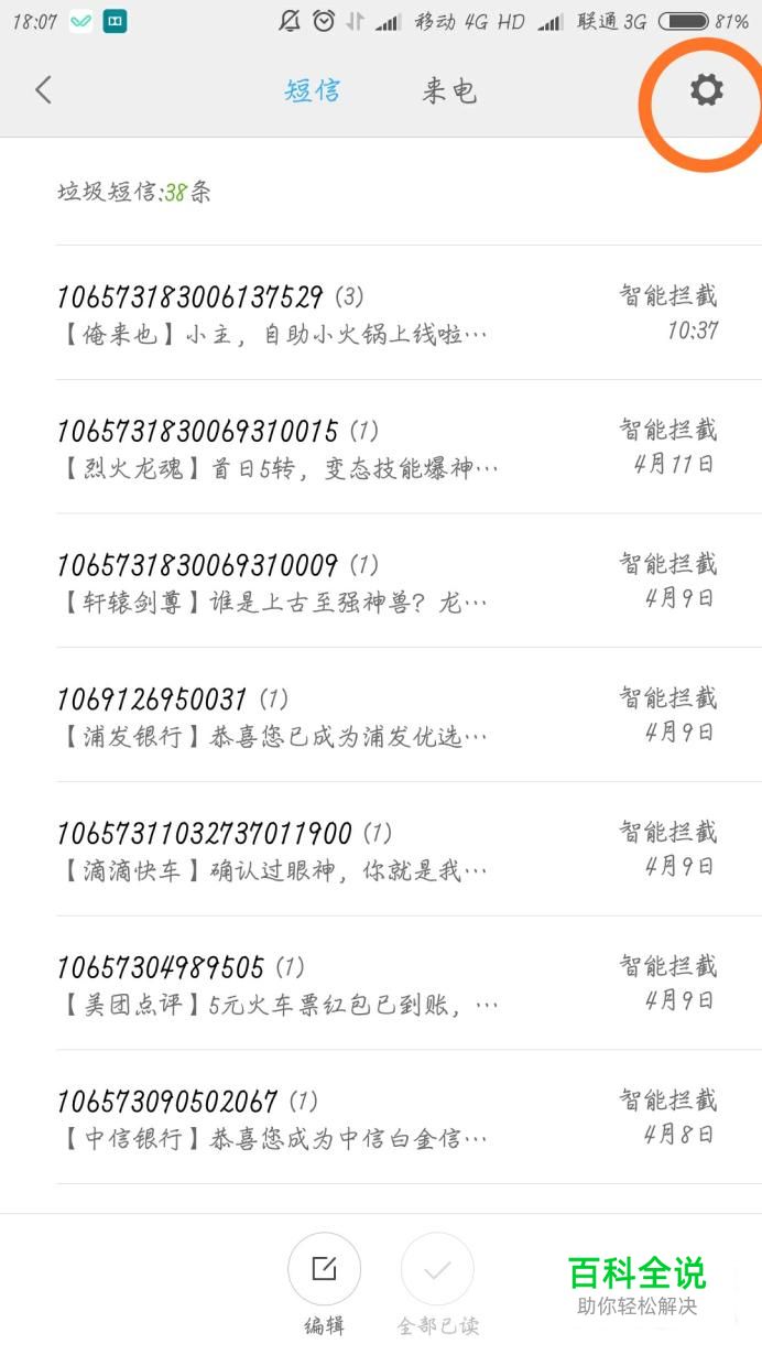 点击右上角齿轮状图标进入骚扰拦截设置,打开骚扰拦截开关