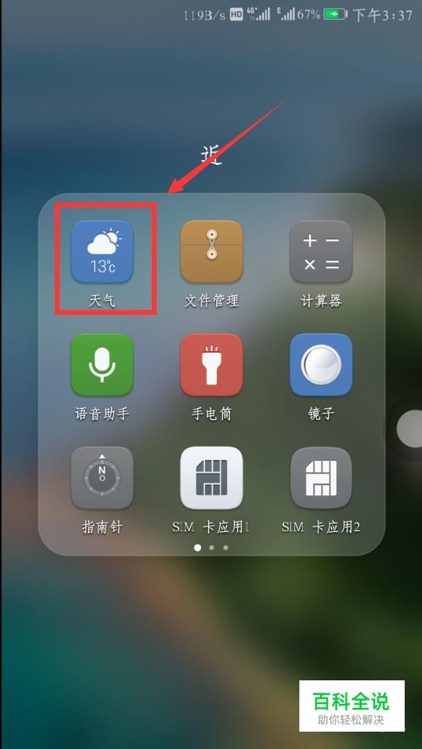 首先打开手机,在手机找到自带的天气软件,点击进入。