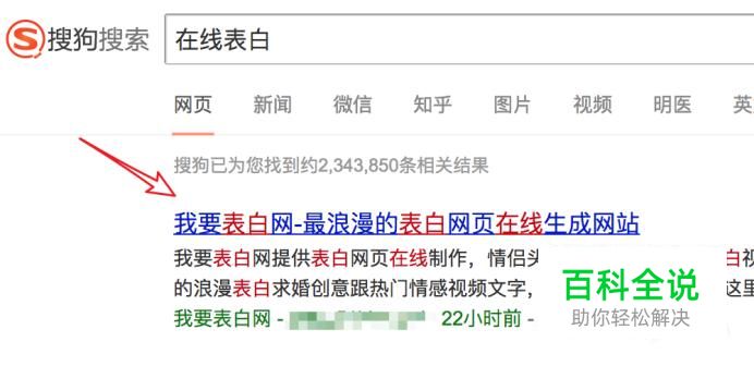 打开搜狗搜索,输入‘在线表白’,在搜索结果里点击打开‘我要表白网’。