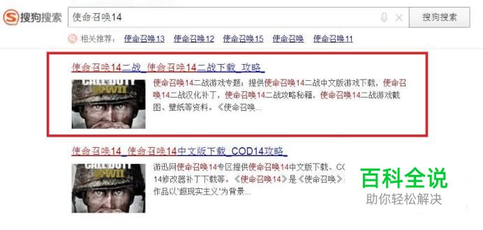 首先,我们使用搜索引擎搜索“使命召唤14”关键字,在搜索结果页面中,点击进入游戏网站。